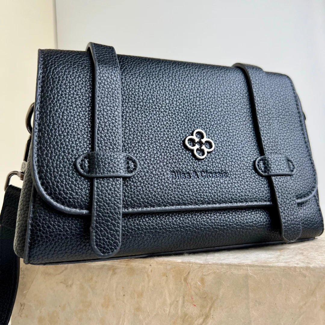 Adorned with a subtle floral emblem on the front flap, the Midnight Ivy combines timeless beauty with practicality. Its structured silhouette ensures enough space for your essentials, while the adjustable strap allows for versatile wear, whether over the shoulder or as a crossbody. The bag is secured with magnetic snaps, providing easy access while keeping your belongings safe.