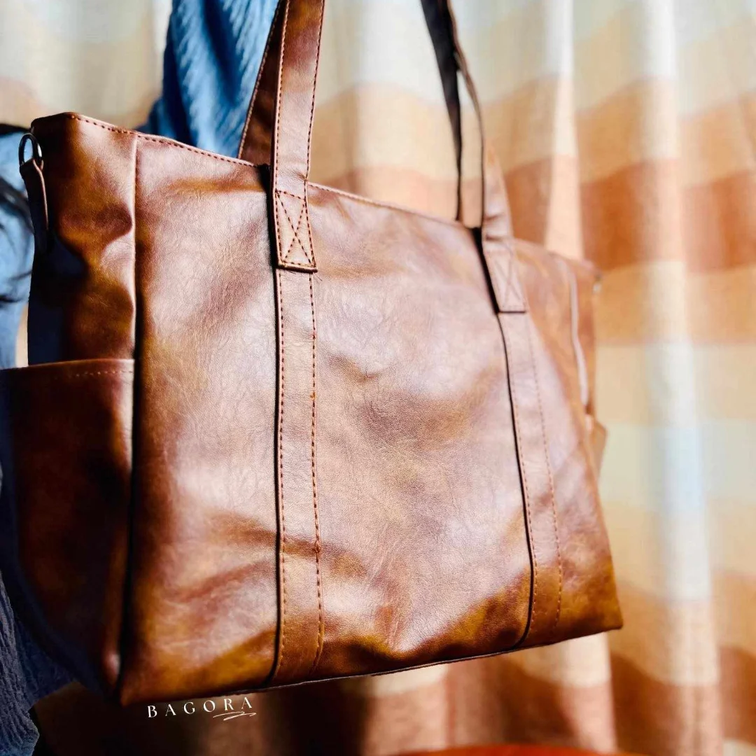 The Vintage Amber Tote is a beautifully crafted leather bag that exudes timeless elegance. Its warm, rich amber tone complements any outfit, whether casual or professional. With a spacious interior, it is perfect for daily essentials and more. The tote features sturdy double handles for comfortable carrying, an exterior zip pocket for easy access to smaller items, and side pockets for added storage. Ideal for those who appreciate both style and functionality, this bag is a versatile accessory designed for modern living.